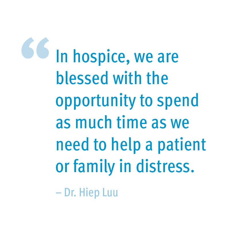 In hospice, we are blessed with the opportunity to spend as much time as we need to help a patient or family in distress. – Dr. Hiep Luu