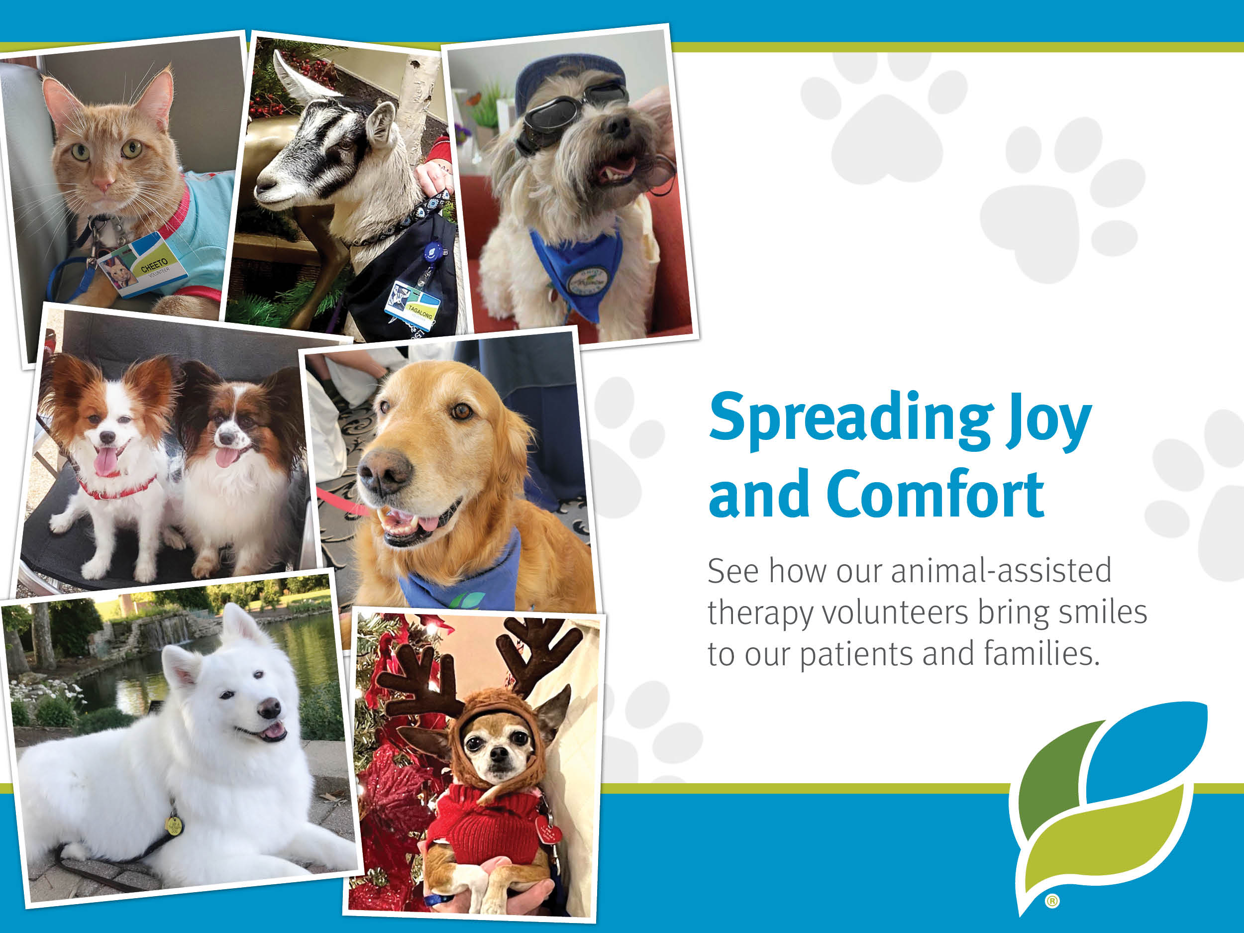 Our animal-assisted therapy volunteers and therapy animals have made a difference in the lives of our patients and their families. If you would like to know more about animal-assisted therapy and how to become a volunteer, visit the links below.