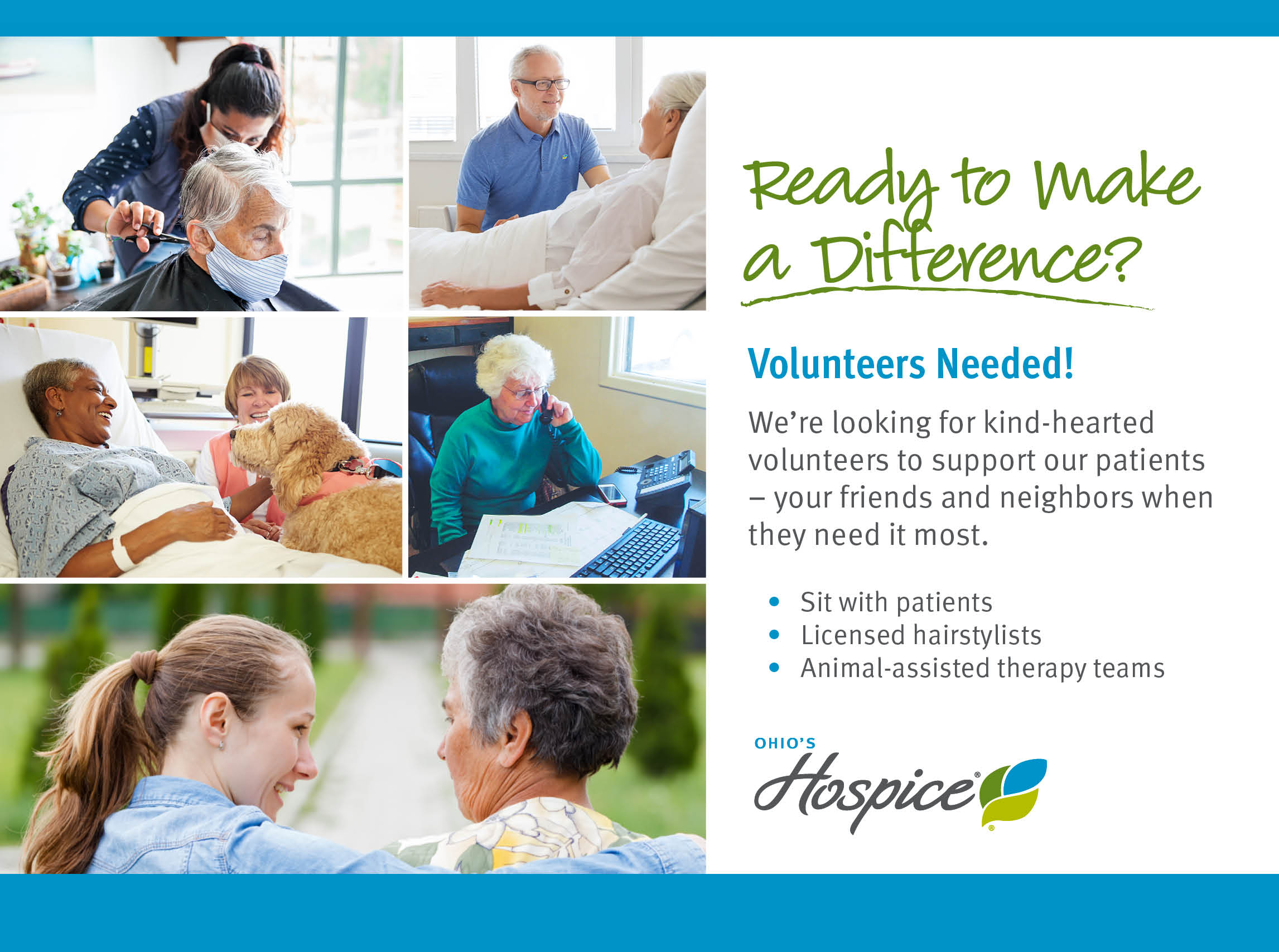 To make a difference by volunteering, please call 937.382.5400 or visit: www.OhiosHospice.org/Volunteer