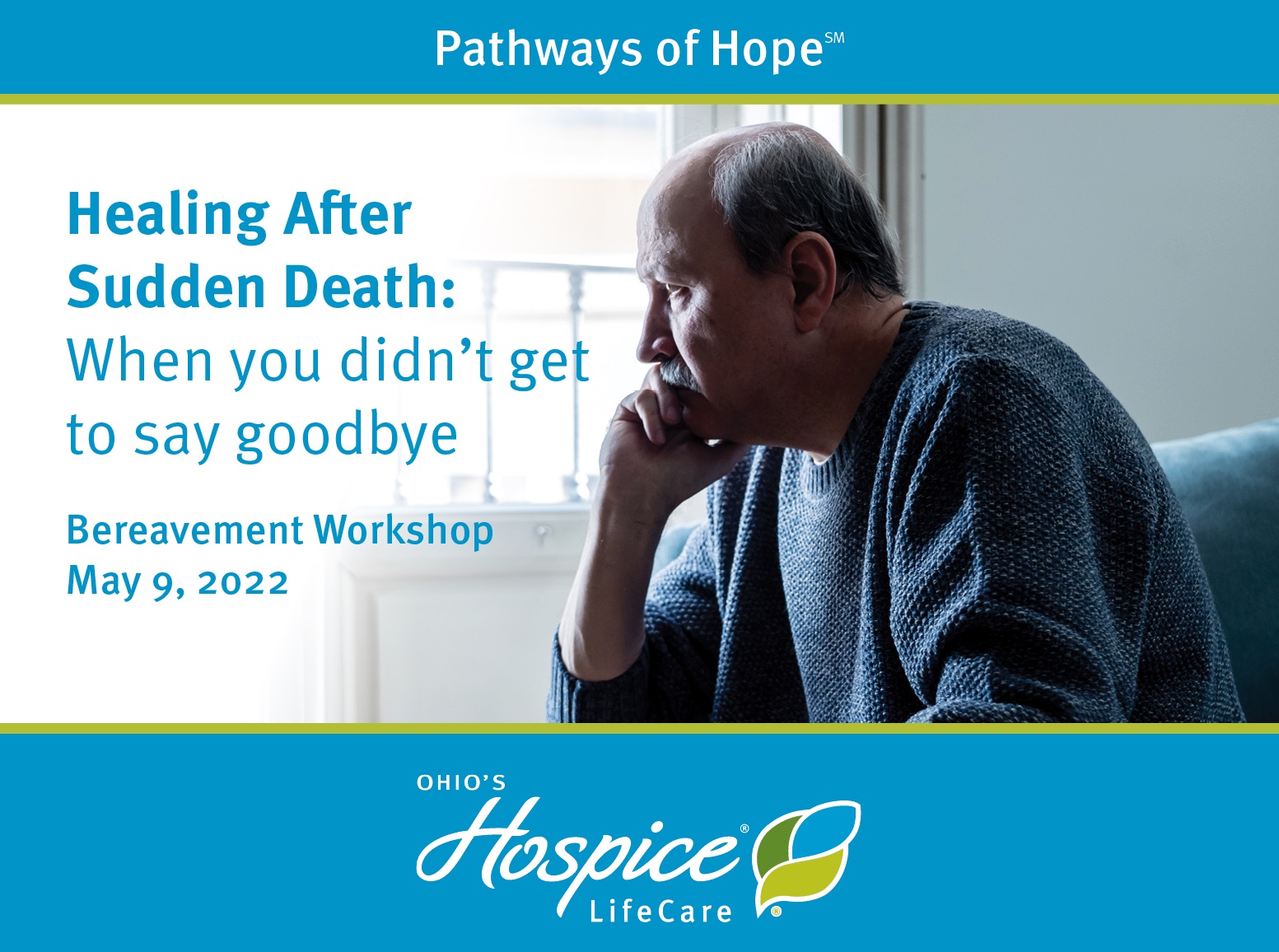 Pathways of Hope℠ Grief Counseling Center at Ohio’s Hospice LifeCare is hosting a bereavement workshop, “Healing After Sudden Death: When You Didn’t Get to Say Goodbye,” on Monday, May 9, 5:30-6:45 pm, at Ohio’s Hospice LifeCare (1900 Akron Rd., Wooster, OH 44691). David Hargrave, LSW, CCTP, CGCS, bereavement counseling professional with Ohio’s Hospice LifeCare, will lead the workshop.
