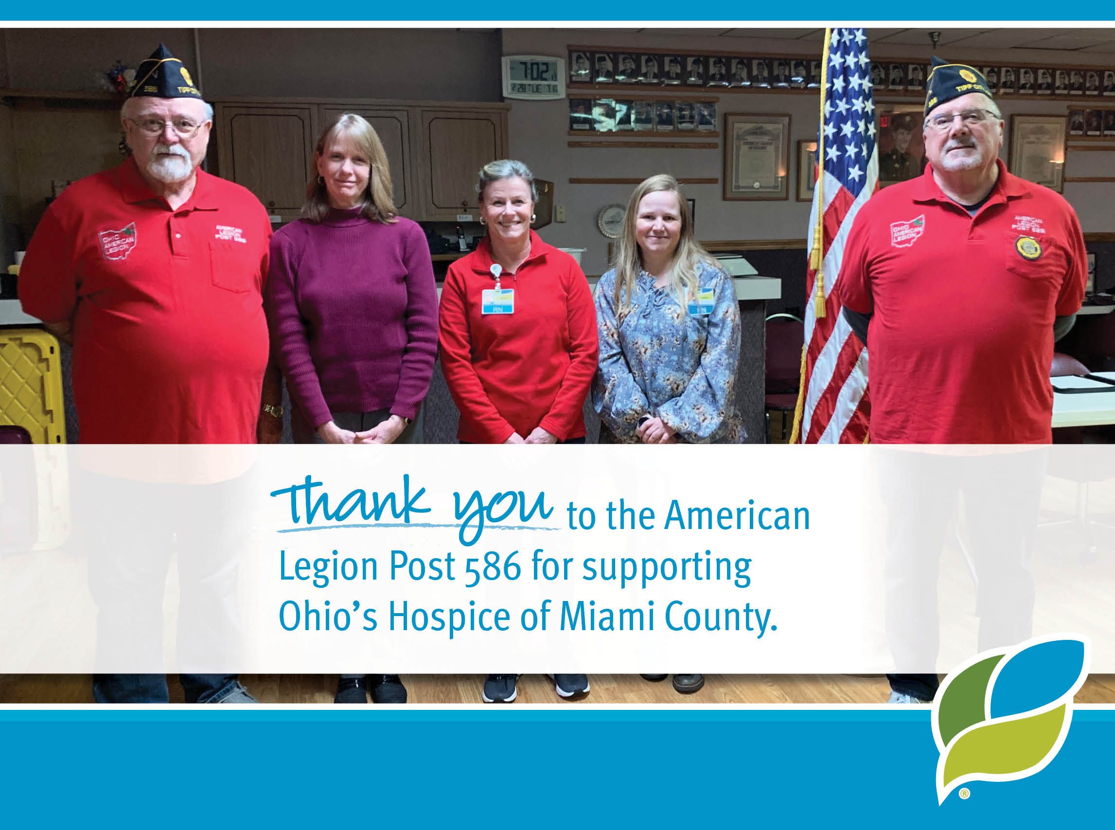 “We thank the members of American Legion Post 586 for supporting our mission with their generous donation. Their gift will benefit patient care and services at Ohio’s Hospice of Miami County,” Short said. “Through support from the community, we are able to continue providing superior care and superior services to the patients and families we are honored and privileged to serve.”