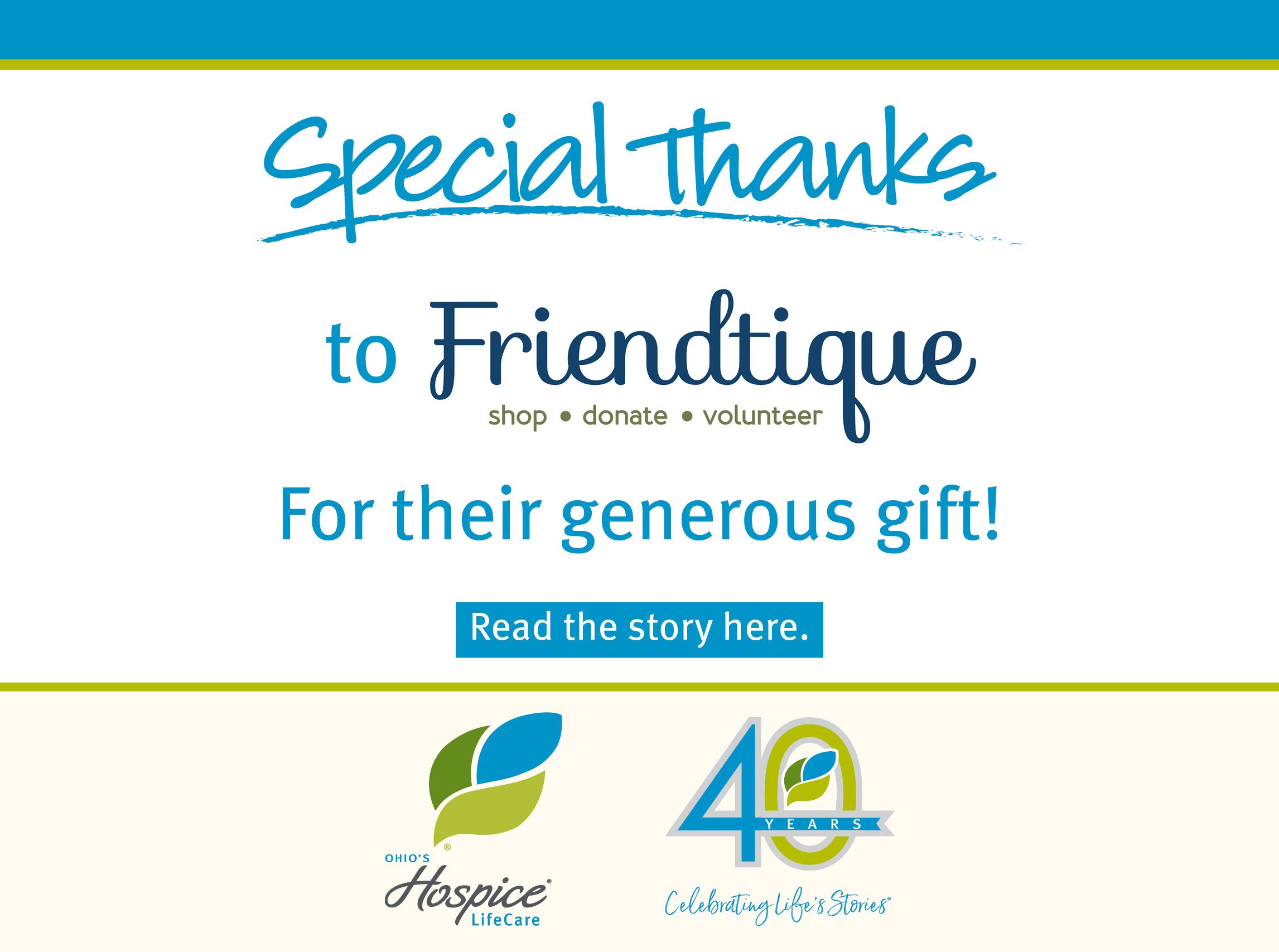 Ohio’s Hospice LifeCare continues to be grateful for its long-standing partnership with Friendtique. A recent $25,000 donation from Friendtique, a longtime boutique resale shop in downtown Wooster, will help support Ohio’s Hospice LifeCare’s Community Care Fund.