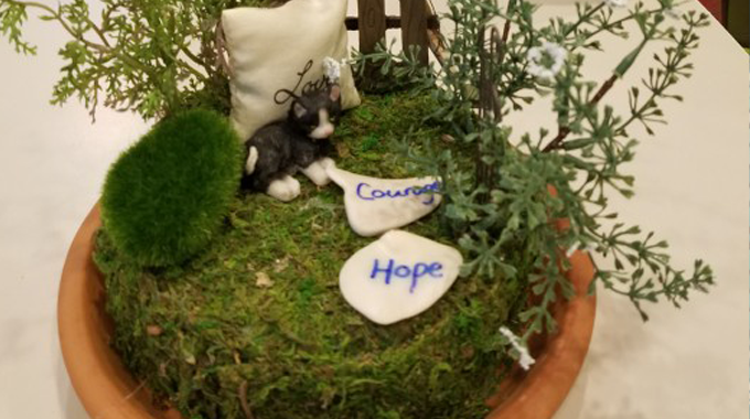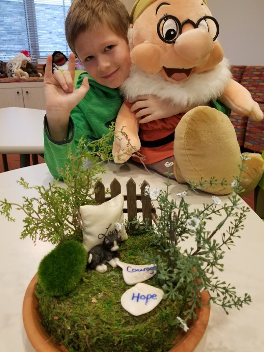 Although kid’s grief camp is over, Ohio’s Hospice LifeCare continues to provide grief support to the children in our community. Pierce Mckee wanted to share his ideal of what a safe place looks like for him. He used the words hope and courage as well as lots of greenery (his favorite color) to demonstrate his journey of loss.