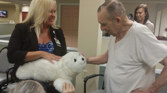 Karen Parziale-McFall, a Community Liaison with Ohio’s Hospice of Butler & Warren Counties, offers visits with robotic animals to area extended care facilities. When she visits with the robotic seal Chloe and cat Mittens, she says her experience reflects similar responses. “I’ve seen patients respond to the Chloe the seal, when they have very little response to other stimuli. It has a calming effect on the resident and can help diffuse certain behaviors.” She says engagement with the robotic pets also stimulates increased social interaction. “When I bring Chloe and Mittens to visit the residents, it helps stimulate conversations and interactions between them. Many residents will start sharing fond memories about pets that they’ve owned in the past.”