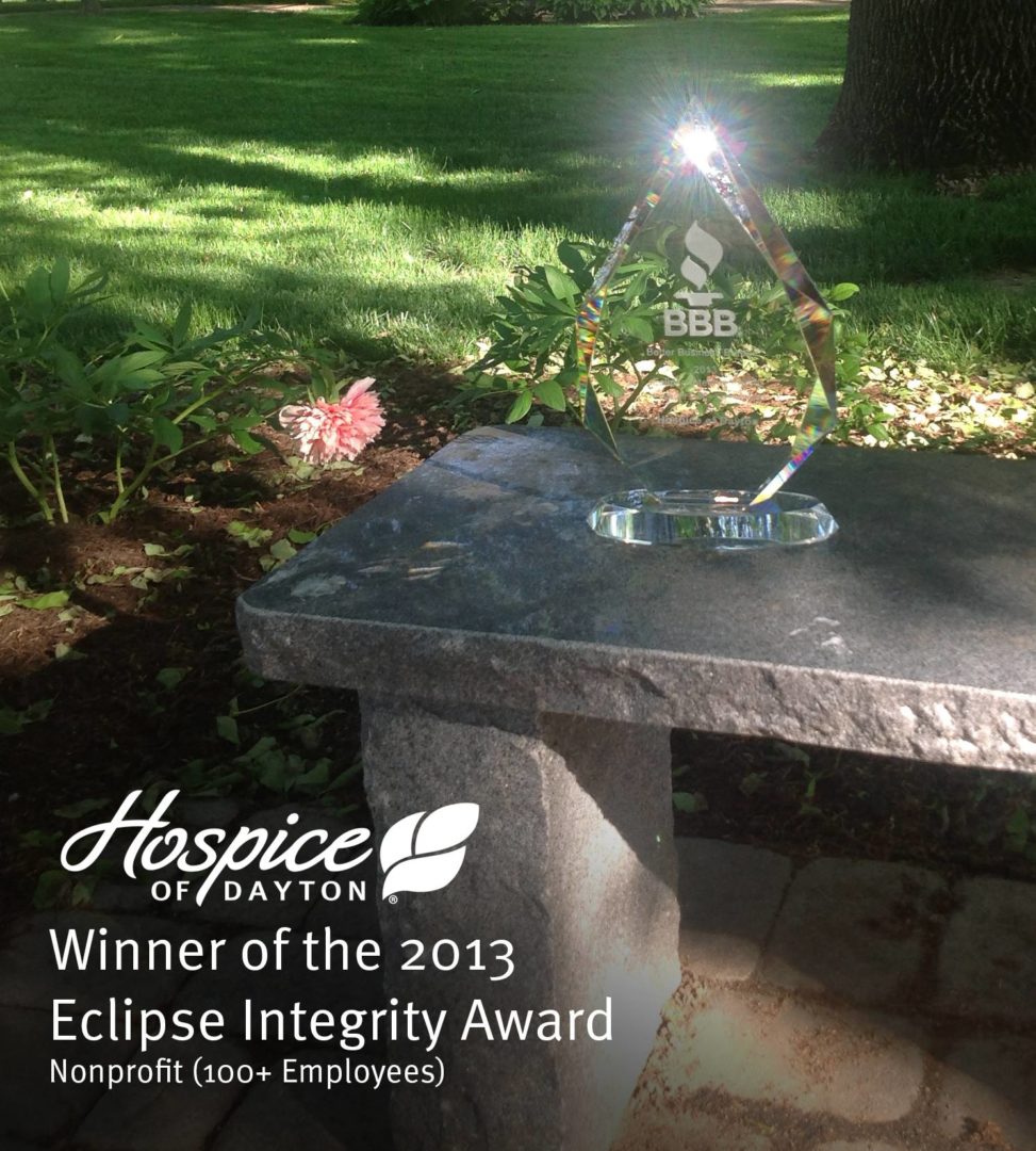 Hospice of Dayton was honored as the large non-profit recipient of the 2013 Better Business Bureau Eclipse Integrity Award,  designed to acknowledge Miami Valley businesses and nonprofits that model ethics, honesty and integrity for the community.  The commitment of Hospice of Dayton to these concepts is reflected in the core values, policies and  high standards central to organizational policies and practices.  Accepting the award, President and CEO Kent Anderson acknowledged those who contributed to the achievement.  “This award is only possible because of our amazing staff, incredible volunteers, exceptional board and generous community support.”