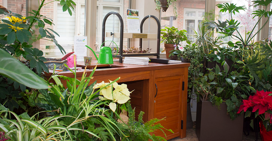 Ohio’s Hospice of Dayton is fortunate to have a solarium for our patients and families to enjoy year around. Our unique octagon shaped solarium is filled with plants and is designed to comfortably accommodate wheelchairs, patient beds and families. There is a sitting bench which houses our water supply and a planting table. On the table there is a small grow light which is filled with plant cuttings, soil, pots and instructions for planting so families can take a plant home in memory of their loved one. We call this a Love Story Garden. Effortless plants such as Jade, Wandering Jew and Cuban Oregano are just some of the plant choices provided. However, we try to accommodate the wishes of patients and families for any plant they might request.