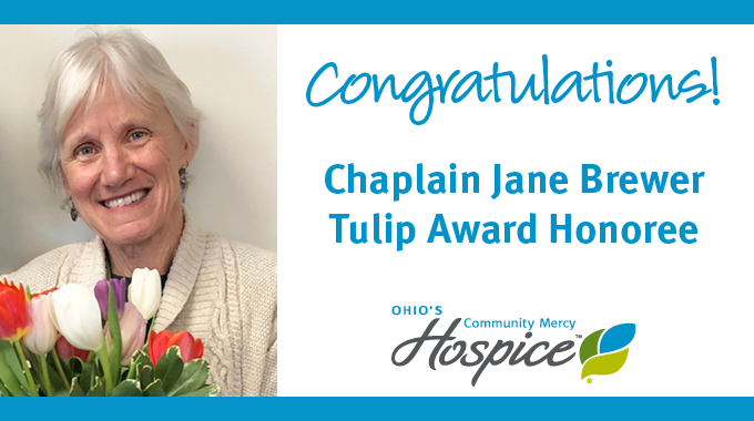 Jane Brewer, chaplain at Ohio’s Community Mercy Hospice, recently received the Tulip Award.