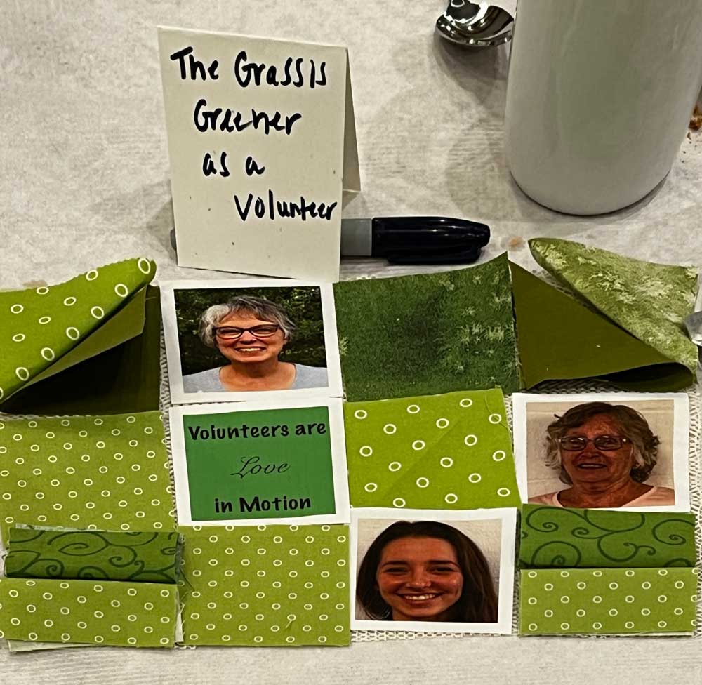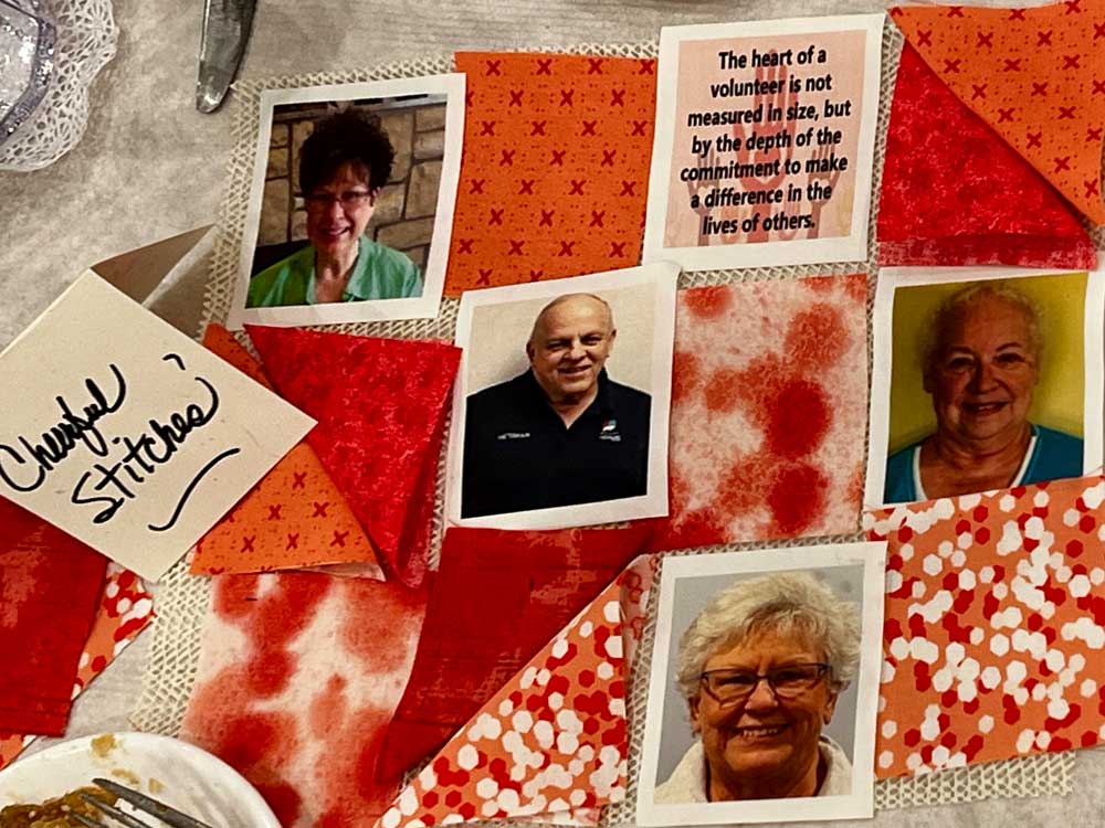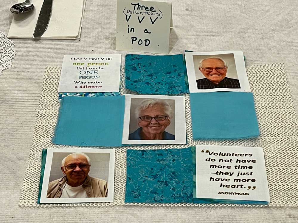 At the volunteer appreciation event, each volunteer picked up a white fabric square with their picture printed on the fabric. The volunteers then found their table by matching the color of cloth squares. Each volunteer was introduced with a paragraph written about the things they do in their volunteer role. They worked with others at the table to make a mini quilt. The mini quilts will be stitched together to create a wall hanging quilt.