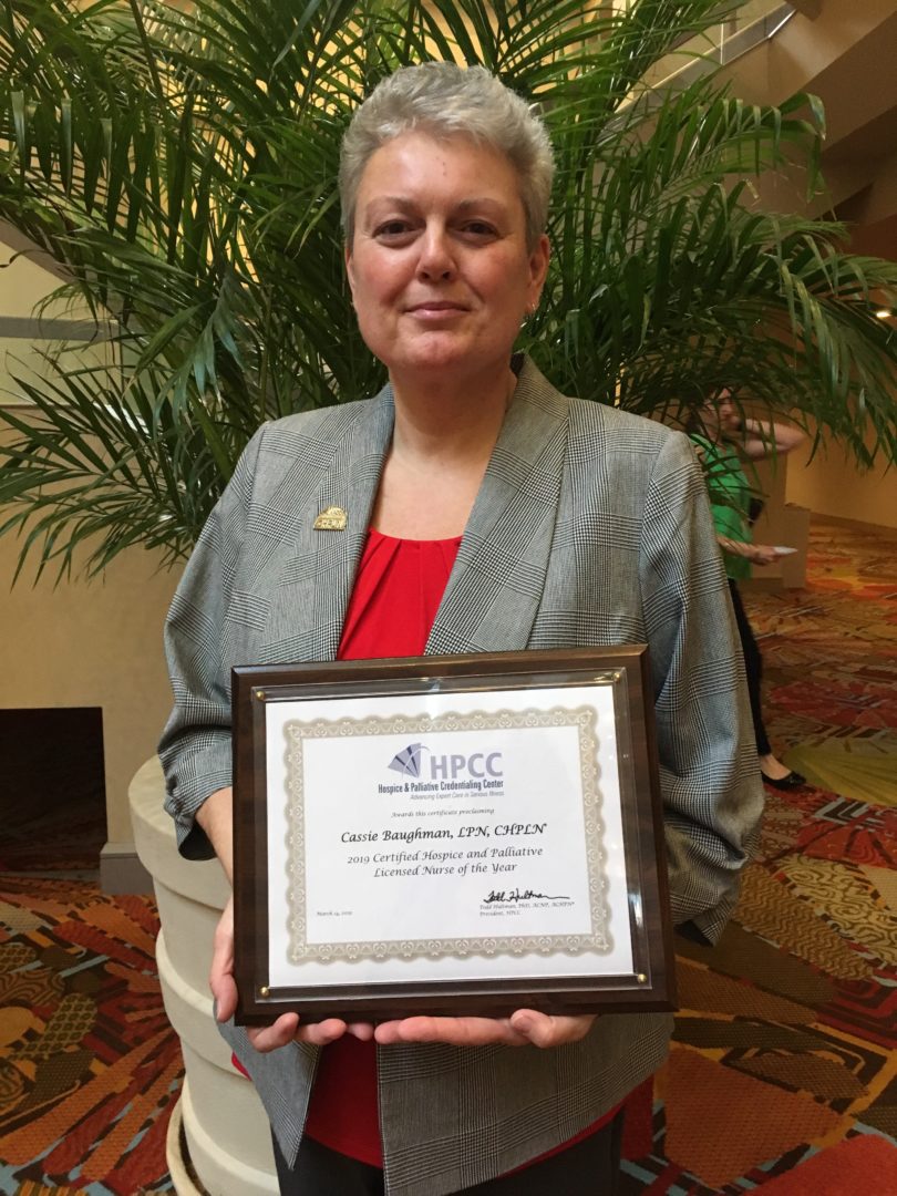 Ohio’s Hospice of Dayton nurse Cassie Baughman, LPN, CHPLN, was named CHPLN Nurse of the Year for 2019 by the Hospice and Palliative Certification Center (HPCC).