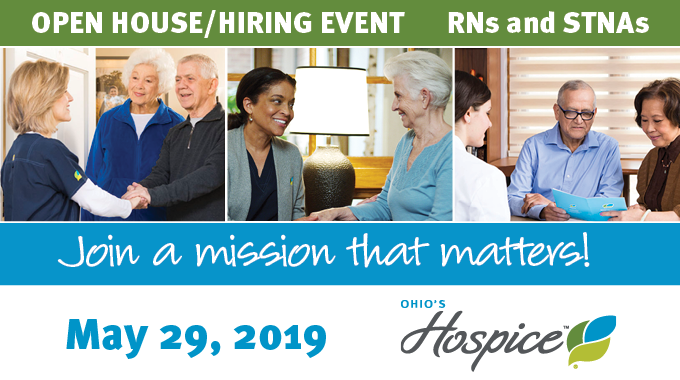 Ohio’s Hospice is hosting an open house and hiring event for registered nurses (RNs) and State Tested Nurse Aides (STNAs) on Wednesday, May 29, 8 am to 5 pm, in the Community Room of Ohio’s Hospice of Dayton (324 Wilmington Ave., Dayton, Ohio 45420).