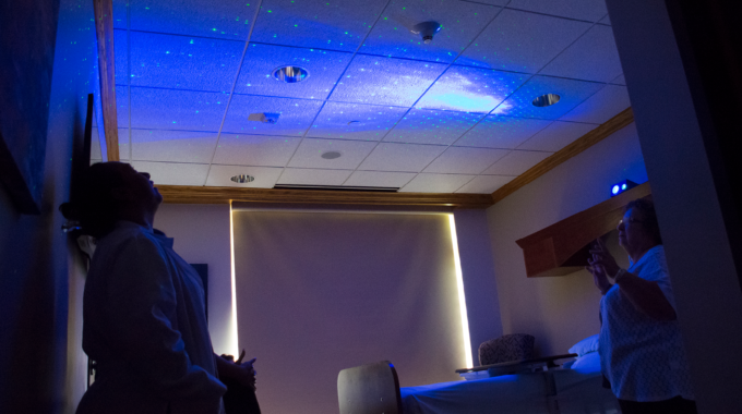 In 2010, Hospice House nurse Kathy Emerson at Ohio’s Hospice of Dayton proposed an experiment entitled “Star Therapy.” The purpose of this therapy was to help relieve the symptoms often experienced at the end-of-life. Starlight TherapyTM uses a projector to project images of stars and clouds, moving in slow motion, across the ceiling of a patient room. The therapy was introduced at the Dayton Hospice House. Positive patient responses were powerful enough to prompt a multi-site research study to assess the effectiveness of Starlight Therapy in addressing specific symptoms. This study lasted over a period of 3 years.