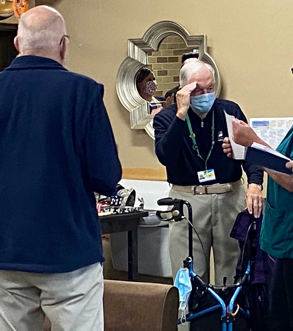 Staff and volunteers from Ohio’s Hospice of Central Ohio held Veteran recognition ceremonies on Nov. 11 for Veterans at local assisted living facilities, including Altercare of Thornville, The Oaks at Bethesda, and Randall Residence of Newark. The team included Veteran volunteers Mike Havens, Joe Machado and Martin Stires in addition to Pam Scanlon, volunteer coordinator, Brian Humphreys, chaplain.