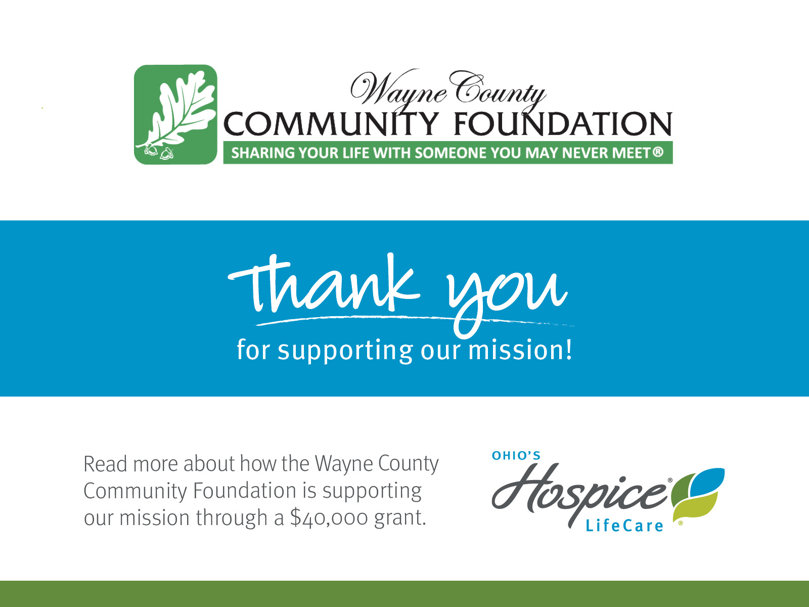 Ohio’s Hospice LifeCare is grateful to the Wayne County Community Foundation for a $40,000 grant, which will be used for patient equipment for comfort and safety.